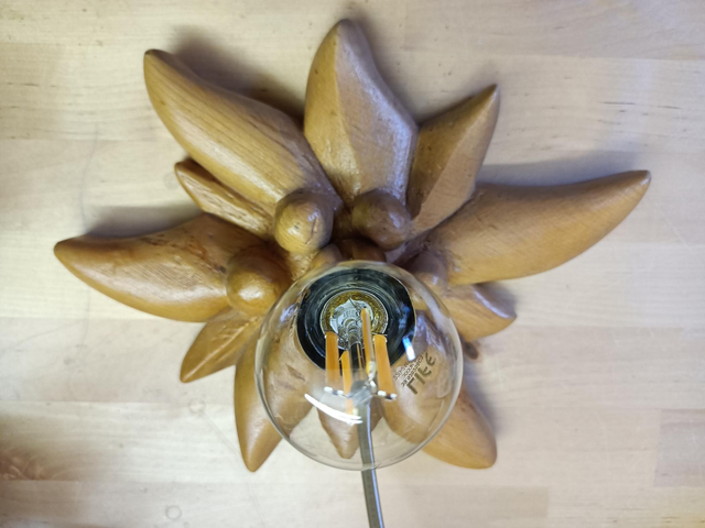 Abatjour basso a forma di stella alpina realizzato in Pino Cembro e intagliato a mano con paralume ricamato in tela Aida .